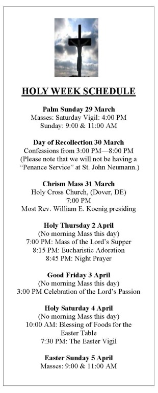 In the event of snow, you can call the main parish number (410) 208-2956 to find out if Mass has been cancelled; a recorded message will alert you to that cancellation. Please check back at this website as well. In addition, the parish will notify WBOC (Salisbury) and ask them to publish any closings.